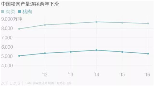一直以來,中國都是肉類消費(fèi)大國。按照美國農(nóng)業(yè)部的估計(jì),中國消費(fèi)者今年所食用的豬肉、牛肉和雞肉加起來會(huì)是美國消費(fèi)者的兩倍。不過,國家統(tǒng)計(jì)局的數(shù)據(jù)顯示,2015 年開始,中國肉類消費(fèi)有所下降。去年,國內(nèi)肉類產(chǎn)量同比下降了 1%,而占比最高的豬肉產(chǎn)量同比減少了 3.4%。