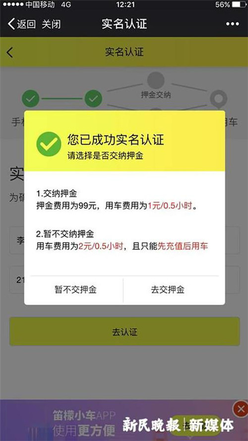 這輛黃色小車車身上貼有二維碼,并寫著“掃碼一元用車”,右側(cè)后輪安裝有四位密碼鎖。小新嘗試掃碼,跟共享單車注冊流程相似,需要手機(jī)注冊和實名認(rèn)證。實名認(rèn)證后,則可選擇是否交納押金,按提示說明,兩者在后續(xù)使用費用上存在差異,交納99元押金后的使用價格便宜一些,半小時1元。
