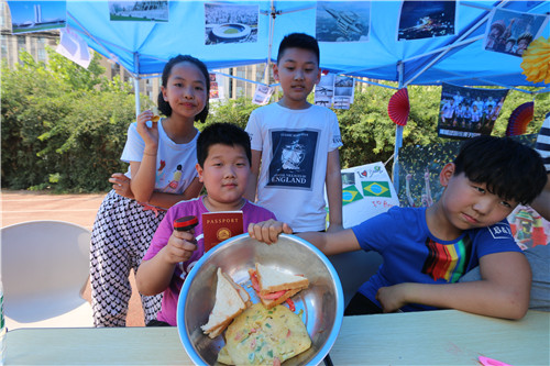 不要以為拿著護照,在校園里隨意的蹭吃蹭喝蹭表演看,這個國際周就算圓滿了。一帶一路“自助游”的路線是這樣的:首先要在教室里,認真學習和了解“一帶一路”沿線國家的靜態(tài)文化展示;接著去操場和報告廳體驗國家的動態(tài)文化展示——美食、舞蹈、音樂等民俗文化;最后去簽證官處“面簽”,想要拿到簽證絕非易事,還得回答“簽證官”提問的問題,如“看我們的國旗,我們是哪個國家的?”“我們國家什么最著名呀?”等問題,而問題的答案,都在孩子們精心準備的文化展板里。如果你被簽證官“拒簽”,那么請你再去學習深造一下。你瞧,孩子們可不覺得這是一場游戲,而是把這看出是一堂課程、一次學習,一次檢驗自己知識儲備的考試。當孩子們集齊所有國家的簽證,那么學校會有神秘的兒童節(jié)禮物獎勵你。
