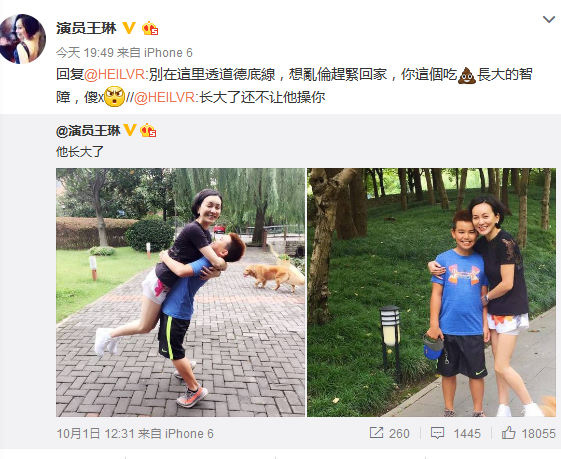 網(wǎng)友看到這一對(duì)高顏值的母子后,紛紛留言表示羨慕,而有網(wǎng)友卻在微博下辱罵到:“長(zhǎng)大了還不讓他x你?!贝藲^評(píng)論也惹怒王琳,并手撕網(wǎng)友回罵道:“別在這里透道德底線,想亂倫趕緊回家,你這個(gè)吃屎長(zhǎng)大的智障,傻x!”