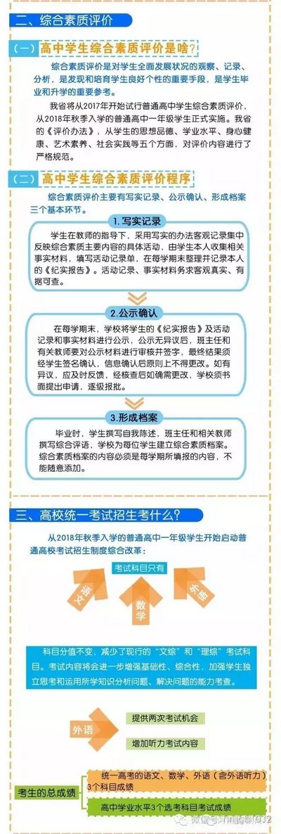 按照《方案》要求,我省從2018年秋季入學(xué)的普通高中一年級學(xué)生開始啟動高考綜合改革,考生總成績由統(tǒng)一高考的語、數(shù)、外3科成績和高中學(xué)業(yè)水平3個選考科目成績組成。招生錄取實(shí)行基于統(tǒng)一高考成績和高中學(xué)業(yè)水平考試成績、參考學(xué)生綜合素質(zhì)評價擇優(yōu)錄取機(jī)制。