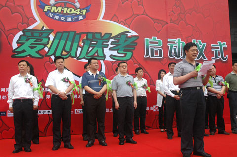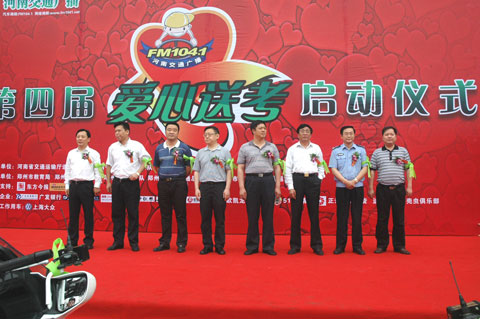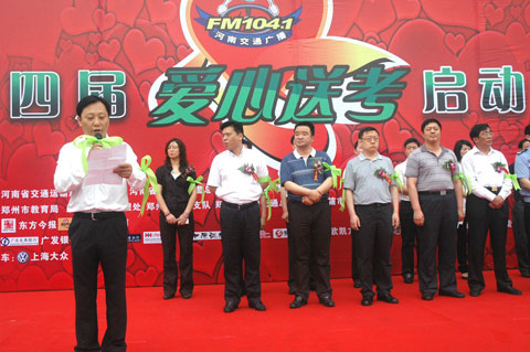 6月4號(hào)上午,隨著河南人民廣播電臺(tái)總編輯張大寶宣布啟動(dòng)。河南交通廣播第四屆全省愛(ài)心送考大型公益活動(dòng)正式拉開(kāi)帷幕。河南省交通運(yùn)輸廳道路運(yùn)輸局、河南省公安廳交警總隊(duì)、河南人民廣播電臺(tái)以及鄭州市教育局、鄭州市交警支隊(duì)、鄭州市客運(yùn)管理處、鄭州市公交總公司等多家單位的領(lǐng)導(dǎo)出席了活動(dòng)儀式。