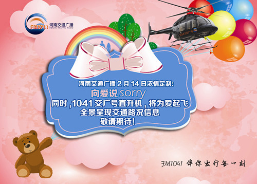2月14日當(dāng)天,1041交廣號直升機(jī)也將再次為愛起飛,在全景呈現(xiàn)路況信息的同時,為您提供情人節(jié)私人定制飛行。如果你足夠幸運,將有機(jī)會坐上1041交廣號直升機(jī),和你的那個Ta獨享二人世界,遨游藍(lán)天、一起俯瞰鄭州美景。