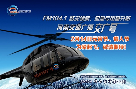 2月14日,河南交通廣播將送來“中西合璧情人節(jié)”重磅大禮——“向愛說sorry”交廣號私人定制浪漫情人節(jié)。當(dāng)天,1041交廣號直升機(jī)將再次為愛起飛,全景呈現(xiàn)省會鄭州交通路況,并聯(lián)合二七萬達(dá)廣場,提供情人節(jié)私人專機(jī)浪漫飛行,現(xiàn)在參與河南交通廣播節(jié)目微信互動(dòng),就有機(jī)會和你的TA坐上1041交廣號專機(jī),獨(dú)享二人世界,不妨來一場浪漫的空中求婚儀式。