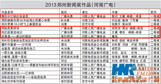 首屆“鄭州新聞獎(jiǎng)”在北京評審,評委會(huì)對參評作品進(jìn)行了認(rèn)真細(xì)致的評議,經(jīng)過初評、定評共評出特等獎(jiǎng)3篇、一等獎(jiǎng)14篇、二等獎(jiǎng)30篇、三等獎(jiǎng)42篇。頒獎(jiǎng)會(huì)對獲獎(jiǎng)?wù)哳C發(fā)了證書和獎(jiǎng)杯,并給予一等獎(jiǎng)5000元、二等獎(jiǎng)3000元、三等獎(jiǎng)2000元的獎(jiǎng)勵(lì)。河南人民廣播電臺報(bào)送的作品以新聞性強(qiáng)、主題重大、思想深刻、制作精良、廣播特色突出而獲評委好評。其中河南電臺信息廣播郭珂、王昊采寫的消息《寒風(fēng)中忙碌的快遞員》,通過對鄭州市一名普通快遞員劉師傅的跟隨式采訪,將他真實(shí)的工作狀態(tài)和內(nèi)心世界一一展現(xiàn),生動(dòng)、感人,獲得了一等獎(jiǎng);《網(wǎng)格員吳明華》、《毛莊蔬菜進(jìn)城記》、《走基層——身邊的感動(dòng)》 3 件作品獲得二等獎(jiǎng);《走基層 探訪地鐵盾構(gòu)施工》等5件作品獲得三等獎(jiǎng)。河南電臺信息廣播記者郭珂作為獲獎(jiǎng)記者代表在頒獎(jiǎng)會(huì)上發(fā)了言,表示要按照河南臺的要求和安排,進(jìn)一步轉(zhuǎn)變作風(fēng),寫出面貌一新、聽眾喜聞樂見、無愧于偉大時(shí)代的作品來。