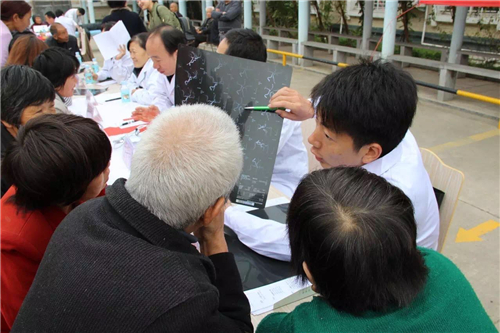 雖然天氣轉涼,但絲毫沒有澆熄大家的熱情,當?shù)氐木用裨缭鐏淼搅x診現(xiàn)場,等候省會頂尖醫(yī)院專家為自己診斷,專家們也是十分準時,提前到現(xiàn)場為患者看診。
