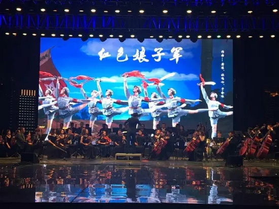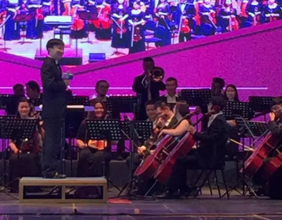 伴隨臺上指揮黃俊博的手勢起,河南愛樂樂團開始演奏交響樂《紅旗頌》。