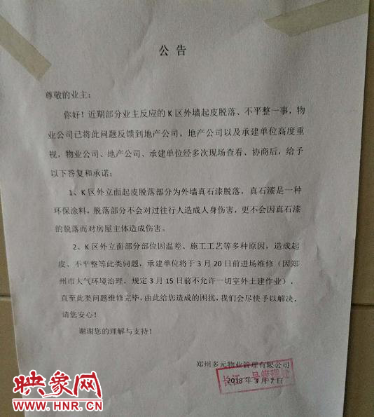 不過,發(fā)稿前,“大象幫辦”記者接到了該小區(qū)物業(yè)的最新消息:為消除業(yè)主的顧慮,他們已在小區(qū)單元門口張貼公告,向業(yè)主解釋了外立面凸起產生原因,并承諾承建單位工程部將組織維修人員在3月20日之前進場維修,直至此類問題維修完畢。
