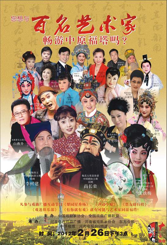 河南電臺戲曲廣播、河南省戲劇家協(xié)會發(fā)起并聯(lián)合中國戲劇家協(xié)會、全國戲曲廣播聯(lián)盟共同推出的“全國百名藝術家暢游中原福塔”觀光活動將于2012年2月26日下午3點舉行。