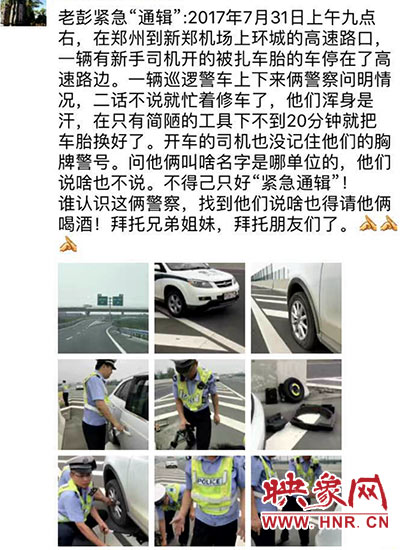 據(jù)介紹,7月31日9時(shí)許,河南省公安廳高速交警總隊(duì)一支隊(duì)執(zhí)勤民警徐玉成、余曉偉巡邏到機(jī)場高速與鄭州西南繞城高速互通處附近時(shí),看到北向南方向一輛白色轎車停在高速路邊,上前一看車輛前輪輪胎爆胎了,司機(jī)急著去開會(huì)卻不會(huì)修車,急得滿頭大汗卻無從下手,民警了解情況后,二話沒說在酷暑高溫天氣迅速幫司機(jī)把車胎換好,司機(jī)連聲表示感謝,由于當(dāng)時(shí)急著去開會(huì),沒有來得及問出民警姓名,于是就出現(xiàn)了開頭“緊急通緝”的一幕,公司領(lǐng)導(dǎo)和員工也紛紛轉(zhuǎn)發(fā)正能量,“通緝”找人。伸手幫一把,傳遞正能量一大片。