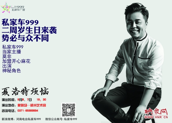 活動內容:正值私家車999兩歲生日來臨之際,私家車999特邀開心麻花全國票房口碑雙料冠軍《夏洛特煩惱》在鄭州象劇場開演,私家車999主持人將擔綱劇中角色,9月6日、9月7日象劇場鄭州藝術宮,一起來過生日吧!