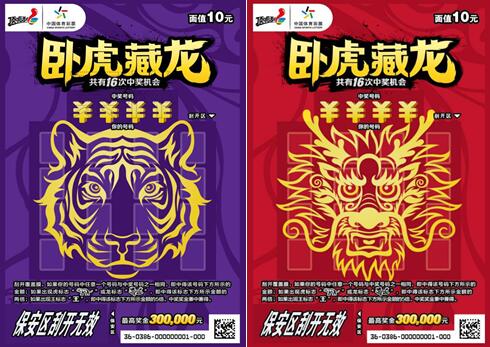 本次上市的“臥虎藏龍”主題即開套票,共有5元、10元、20元三種面值。票面設(shè)計(jì)色彩濃郁、霸氣美觀,“虎頭”、“龍頭”標(biāo)識(shí)躍然于票面正中,“眼神”犀利且極富“挑戰(zhàn)”意味,寓意充滿自信,敢于挑戰(zhàn)最高獎(jiǎng)金。