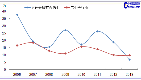 圖1 2006-2013年工業(yè)全行業(yè)及鐵礦業(yè)工業(yè)增加值增速情況 數(shù)據(jù)來源:中國統(tǒng)計局