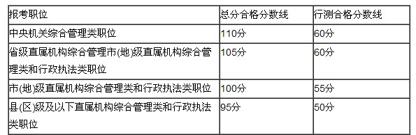其中,報(bào)考中央機(jī)關(guān)綜合管理類職位的合格分?jǐn)?shù)線較去年相比有所提高,總分不低于110分,且行政職業(yè)能力測驗(yàn)不低于60分。分?jǐn)?shù)線劃定如下表: