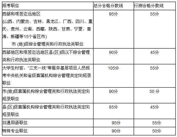 其中,西部地區(qū)和艱苦邊遠(yuǎn)地區(qū)綜合管理類和行政執(zhí)法類職位的合格分?jǐn)?shù)線總分不低于95分,且行測不低于55分。非通用語職位的合格分?jǐn)?shù)線總分不低于95分,且行測不低于55分。特殊專業(yè)職位的合格分?jǐn)?shù)線總分不低于90分,且行測不低于50分。銀監(jiān)會(huì)、證監(jiān)會(huì)特殊專業(yè)職位專業(yè)科目考試不低于50分。