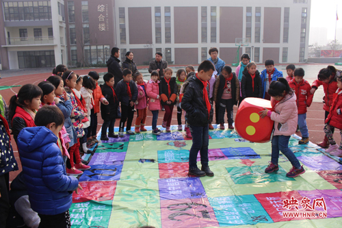 映象網(wǎng)教育頻道訊(記者 劉俊 通訊員 何利敏)“紅燈停,綠燈行,向前2步……”“阻止家人酒后駕車向前3步……”在鄭州市高新區(qū)五龍口小學的操場上,一場別開生面的“下棋”比賽正在進行。在一張巨無霸“交通安全飛行棋”棋盤上,同學們扮作“棋子”,在棋盤上的小方格之間“穿梭”。一道道交通安全知識題目“攔”在“棋子”面前,答對問題方可繼續(xù)“前行”。
