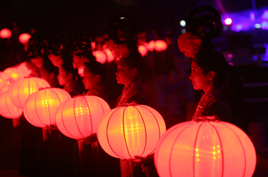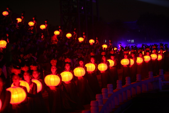 尾聲時(shí),伴隨著一曲《水調(diào)歌頭》,寄托大家心中的美好,這時(shí),無數(shù)盞紅色燈籠由少女們舉過頭頂,緩緩步入舞臺中央,形成一個(gè)巨大的月亮造型,柔和、寧靜,與遠(yuǎn)處的廊橋樓閣共同組成一幅壯觀的景象,令人回味悠長。
