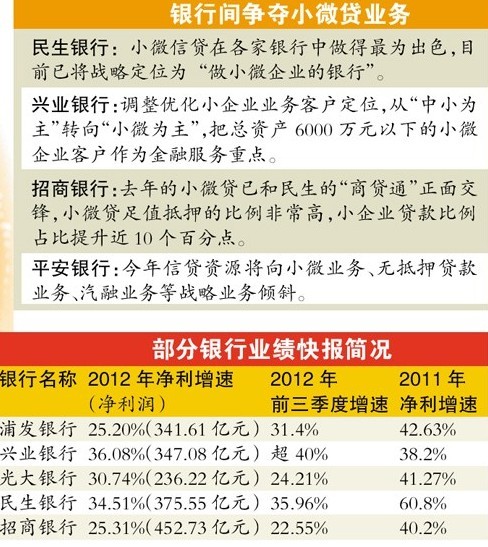 其中一個重要的對手將是興業(yè)銀行。興業(yè)銀行昨日披露,2013年,興業(yè)銀行積極調整優(yōu)化小企業(yè)業(yè)務客戶定位、經(jīng)營戰(zhàn)略和發(fā)展目標,將總資產(chǎn)6000萬元以下的小微企業(yè)客戶作為金融服務重點,并配套實施一系列體制機制改革措施和投入資源保障,全面推進小微企業(yè)金融服務升級。