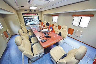 余軍生說,除了通信功能,該車還具備指揮和生活能力?!榜{駛室后排有上下臥鋪,可供休息,車里有冰箱、飲水機、微波爐等設備,可以滿足地震工作人員野外需求?!?/p>