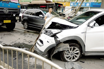 范先生的說法得到路口東北角一家醫(yī)院保安李師傅的證實。李師傅說,事發(fā)時,他就面向西南坐在醫(yī)院門口,當(dāng)時南向北是綠燈,東向西是紅燈:“我先聽到了刺耳的剎車聲,抬頭看到白色現(xiàn)代帶著刺耳的剎車聲從南邊沖過來,然后拐向東北角,撞到了在路口等紅燈的淺灰色轎車?!?/p>