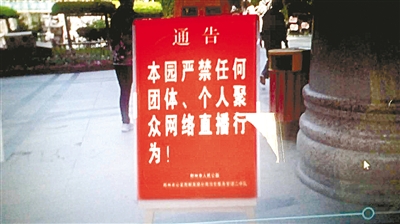 4月19日上午,市民王先生來電稱,紅極一時(shí)的人民公園的尬舞被叫停了,不知什么原因。上午10時(shí),記者來到人民公園東門,進(jìn)門就看到一張紅紙告示“本園嚴(yán)禁任何團(tuán)體、個(gè)人聚眾網(wǎng)絡(luò)直播行為!”