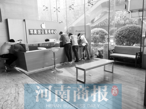 昨天上午,河南商報記者來到了升龍大廈一樓。該手機(jī)維修點有多處“蘋果”的標(biāo)志,柜臺里也全是蘋果手機(jī)以及相關(guān)配套產(chǎn)品,有兩個消費者在維修蘋果手機(jī)。