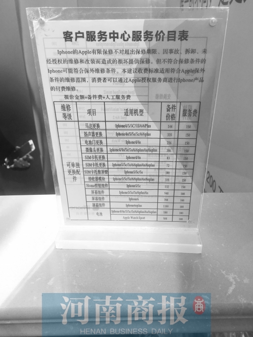 拿蘋果6S更換屏幕來說,這里標(biāo)價1200元,而河南商報記者在文化路、隴海路等手機(jī)維修點了解到,維修費用四五百元即可。