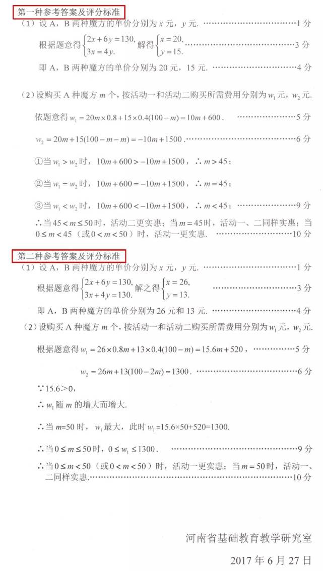 該題不存在科學(xué)性錯誤,但在文字表述上不夠精準,致使部分考生產(chǎn)生不同理解。按照題目給定的條件,可以有兩種解法。除《二0一七年河南省普通高中招生考試試卷、參考答案及評分標(biāo)準》給定的解法和答案外,還有另外一種解法和答案。兩種解法都能考查出同樣的數(shù)學(xué)思維和方法,且難度相當(dāng)。