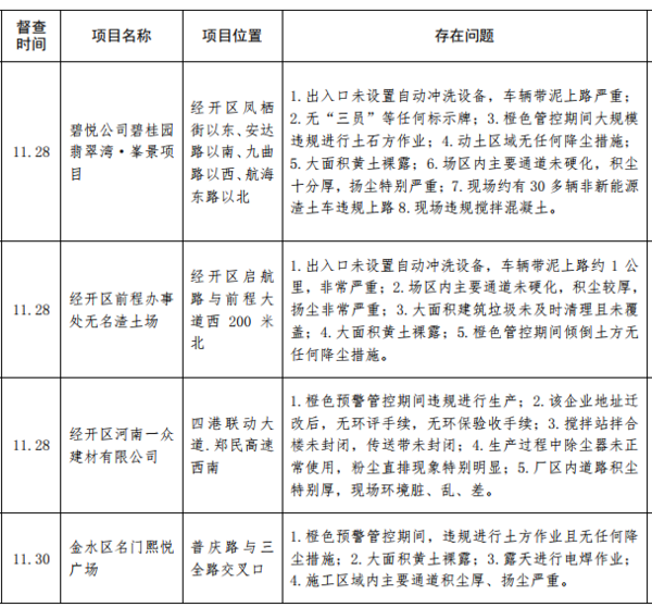 12月7日,記者從鄭州市環(huán)境污染防治攻堅辦了解到,11月27日至12月3日,鄭州市環(huán)境污染防治督導組重點對全市"封土行動"方案、橙色預警管控措施落實和30天沖刺行動方案落實情況進行督導檢查。從督查情況來看,大部分單位都夠按照要求,落實"封土令"和預警管控措施,但也有個別施工工地和企業(yè)未按要求停工、停產或限產減排。