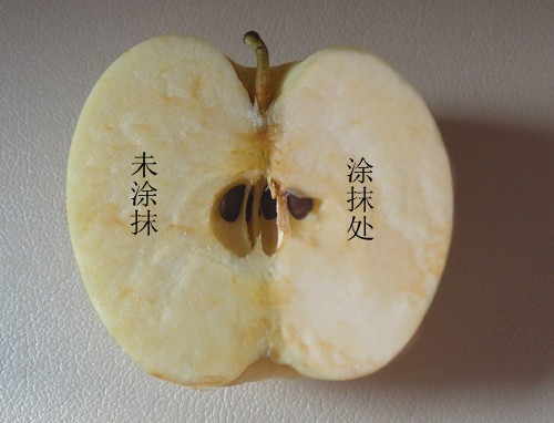 把涂抹了精華液的蘋果放在未見陽(yáng)光的桌上4小時(shí)后,涂抹精華液的右面沒有氧化變黃,依然水分充足,滋潤(rùn)新鮮,而未涂抹的左面就因?yàn)檠趸兊冒迭S干澀。這就說(shuō)明它的抗氧化性極強(qiáng),對(duì)肌膚有很強(qiáng)的保護(hù)作用。