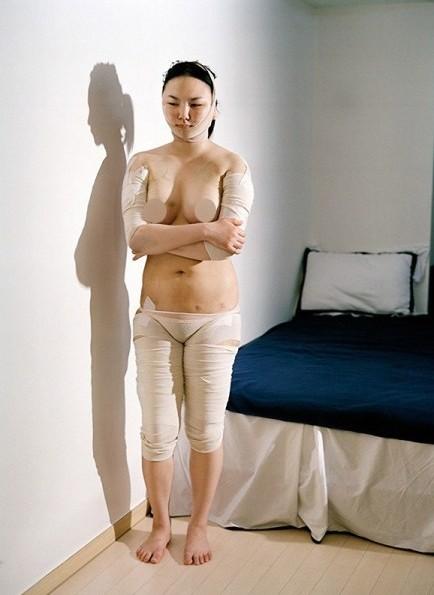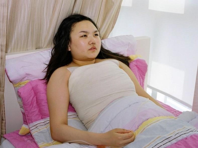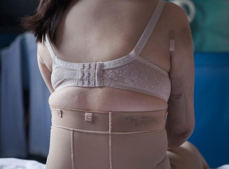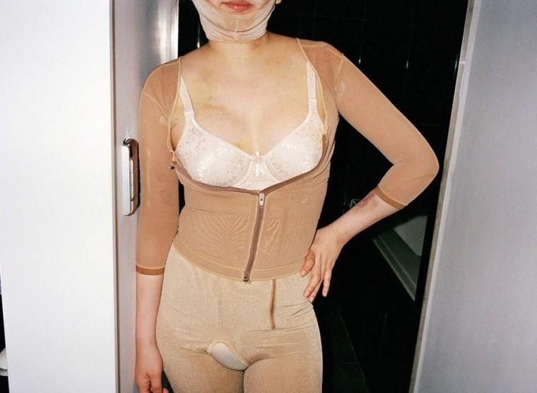 束身衣上下的身型是她的過去和未來,滿是術(shù)后的淤青,疼痛成為美麗代價的一部分。