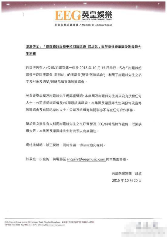 謝霆鋒經(jīng)紀(jì)人霍汶希表示“本集團(tuán)及謝霆鋒先生從來沒有授權(quán)任何人士、公司或組織宣傳或舉辦該演唱會。本集團(tuán)及謝霆鋒先生于發(fā)布及宣傳該演唱會及有關(guān)訊息的人士、公司及組織毫無關(guān)系,不存在任何合作關(guān)系?!币悦夥劢z受騙,同時保留一切法律追究權(quán)利。