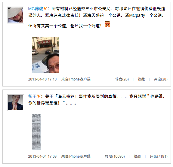 近幾日,三亞“海天盛筵”涉黃,淫亂派對(duì)的新聞可謂瘋傳網(wǎng)絡(luò)。早前有媒體報(bào)道,三亞市委宣傳部曾于4月4日向媒體發(fā)布新聞通稿,稱已經(jīng)對(duì)網(wǎng)上有關(guān)“海天盛筵聚眾淫亂”傳聞?wù)归_調(diào)查,對(duì)此事非常重視。三亞警方今日已正式通知“海天盛筵”主辦方三亞鴻洲國(guó)際游艇會(huì)、“MC白色派對(duì)”主辦方MC俱樂部等相關(guān)單位負(fù)責(zé)人于4月8日面談,配合調(diào)查工作。今天,“海天盛筵”主辦方之一,候鳥俱樂部負(fù)責(zé)人陳駿發(fā)微博稱,自己已經(jīng)將所有材料遞交三亞市公安局,將對(duì)那些還在繼續(xù)傳播詆毀造謠的人,堅(jiān)決追究法律責(zé)任。希望可以還海天盛筵一個(gè)公道。