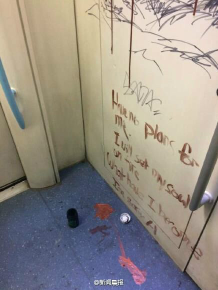 本整潔的地鐵車廂內(nèi)壁,被畫上了“半裸人體”的涂鴉,還用紅色顏料配上了酷似流血的圖案,看起來頗觸目驚心。發(fā)現(xiàn)這一“作品”后,地鐵運(yùn)營方立刻報(bào)警。昨天下午,涂鴉的始作俑者被找到,是一名17歲的外籍少年,隨父母在滬生活?!?/p>