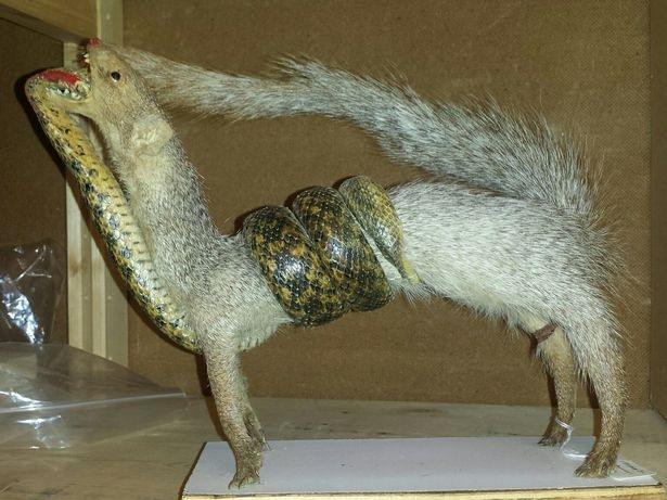 近日,社交媒體上瘋傳一組讓人看了惡夢連連的博物館展覽照,照片中有有恐怖的玩偶、繪畫作品和怪異的模型等。作品之一是,一條蛇和貓鼬緊緊纏在一起,表現(xiàn)的是蛇和貓鼬生死斗爭的最后時刻,最終貓鼬半吞蛇以示勝利。