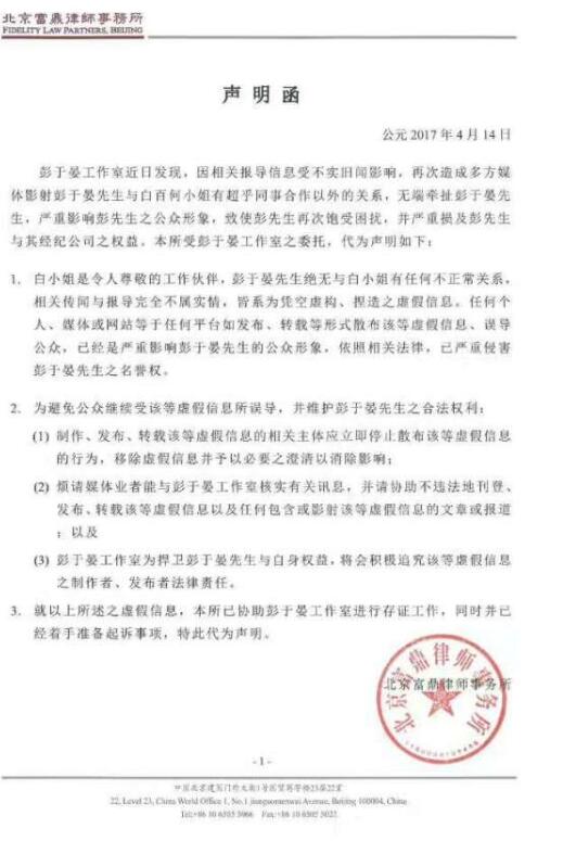 彭于晏方發(fā)聲明:與白百合絕無不正常關(guān)系