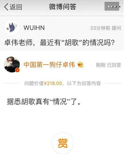 【卓偉回復網(wǎng)友胡歌近況;女友粉大呼心痛:誰這么幸運?】今天不安分的卓偉在微博爆了胡歌的料!稱胡歌最近“有情況”!胡歌的真愛粉和廣大網(wǎng)友一樣氣炸了!總是靠著擦邊球掙錢,太不知所謂了!狗仔不需要職業(yè)操守嗎?