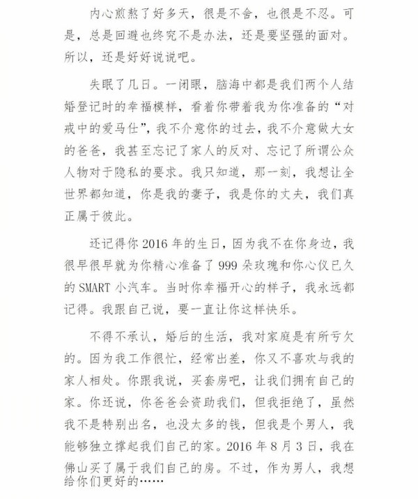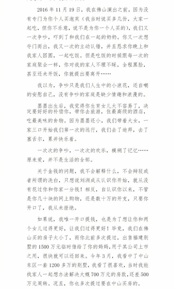 搜狐娛樂訊 5月23日凌晨,劉洲成發(fā)微博回應(yīng)家暴致前妻林苗流產(chǎn)及要求前妻出錢買房等傳聞。劉洲成在文中以時(shí)間為緯度講述他與前妻相識相愛到結(jié)婚的過程,還列舉出前妻從懷孕到流產(chǎn)的事例,劉洲成在文中還稱“從認(rèn)識你開始,就從沒花過你和你家一分錢”。此外,劉洲成更是曬出了昔日的聊天記錄、代付清單、借記卡賬戶歷史明細(xì)清單等證據(jù),疑似反駁前妻所述不實(shí)。