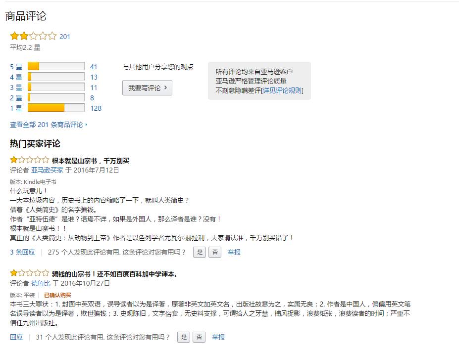 但是,這200條評(píng)論有54條好評(píng),絕大部分評(píng)價(jià)時(shí)間集中于2016年5月15日與16日兩天,且不乏以“前500名評(píng)論者”為標(biāo)簽較有影響力的評(píng)論者的身影。其中某些好評(píng)更是“驢唇不對(duì)馬嘴”,被讀者識(shí)破為是對(duì)尤瓦爾《人類簡史》的評(píng)價(jià)。