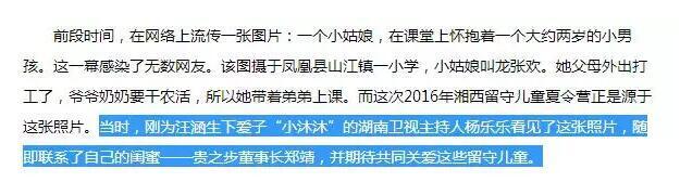 根據(jù)2016年7月一篇來自新浪湖南的文章——《貴之步發(fā)起愛心夏令營情暖湘西留守兒童》描述,湖南衛(wèi)視主持人楊樂樂的閨蜜,便是此次被告上法院的貴之步董事長(zhǎng)鄭靖。