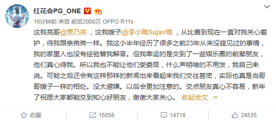 網(wǎng)易娛樂12月31日報道 今天早前,某媒體曝出李小璐夜宿PG ONE家,但同一時間賈乃亮卻在直播中說老婆李小璐正在做頭發(fā),引起網(wǎng)友猜疑。中午,PG ONE發(fā)微博澄清:不能讓他們受委屈。