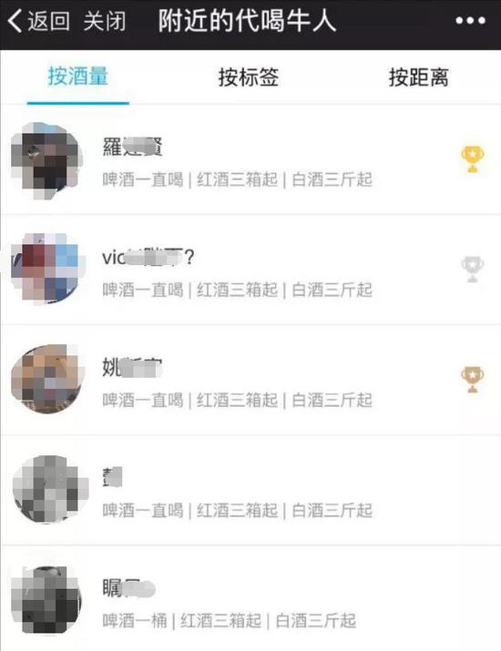 懷著對這項“神服務”的好奇,韓國記者還在中國特地體驗了一番。據(jù)《中央日報》報道,4日晚,韓國記者辦公室所在的北京市中心建國門一帶,記者嘗試使用了該軟件。建國門這附近還不算娛樂區(qū)域,但在半徑400米以內地圖上跳出10名代喝人的位置。記者在點擊其中一名代喝人后立即彈出他的自我介紹——“奧運會金牌級喝酒選手”,“酒量是白酒兩瓶、啤酒一箱”。