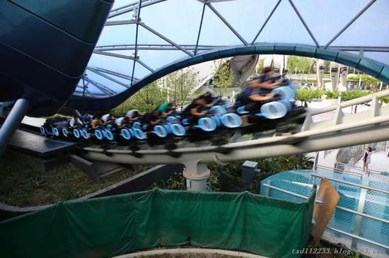 記者一行跟隨導(dǎo)覽員先來到了“極速光輪”區(qū),這是一個(gè)非常受游客追捧的項(xiàng)目,有些類似過山車,但視覺、聽覺和感官的沖擊力遠(yuǎn)比過山車強(qiáng)烈。雖然時(shí)間還早,但進(jìn)口處已經(jīng)排著長(zhǎng)長(zhǎng)的隊(duì),提示等候時(shí)間為2小時(shí)40分鐘。