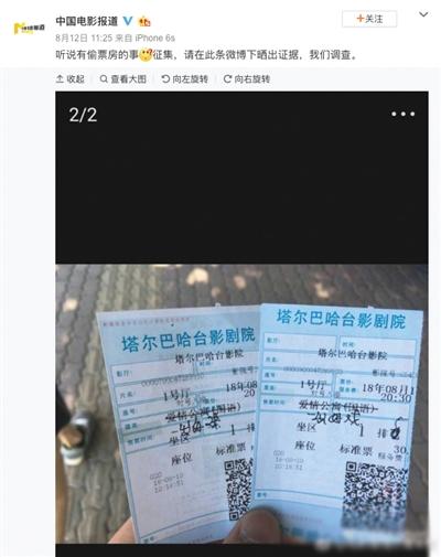 8月12日下午,CCTV6電影頻道旗艦欄目官方微博中國電影報(bào)道發(fā)微博稱,“聽說有偷票房的事,征集,請?jiān)诖藯l微博下曬出證據(jù),我們調(diào)查?!迸鋱D中,是兩張《愛情公寓》的電影票,但電影名字被人工劃掉改成了《一出好戲》。在該微博的評論區(qū),也有不少網(wǎng)友聲明自己遭遇同樣狀況。接著,“愛情公寓涉嫌偷票房”的話題迅速登上熱搜榜。