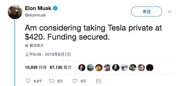 當(dāng)?shù)貢r(shí)間8月7日,馬斯克發(fā)推表示,正考慮將特斯拉以每股420美元(對(duì)應(yīng)市值約720億美元)的價(jià)格將其私有化,并且資金已經(jīng)到位。