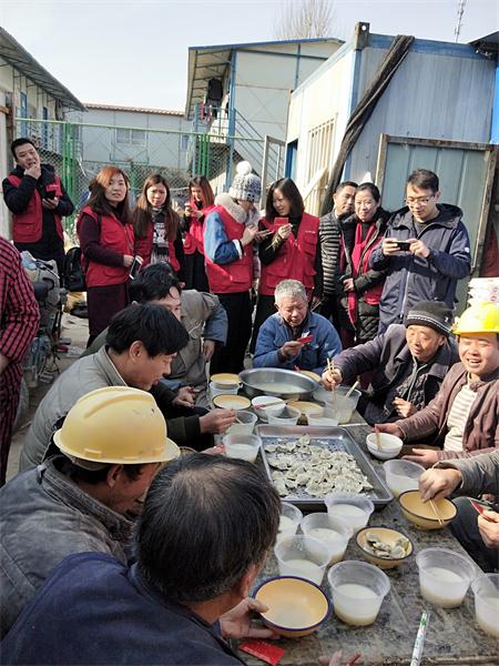 另一邊,在鄭州市花園路廣電南路交叉口,主持人劉雯和韓佳帶著十幾名義工早早的在路邊就開(kāi)始忙活了。他們要給附近50多名環(huán)衛(wèi)工人煮餃子。平時(shí),環(huán)衛(wèi)工們的午飯都很簡(jiǎn)單,甚至都是隨便對(duì)付的,這次,主持人和義工們特意選在離工人們中午休息比較近的地方,搭起了臨時(shí)的灶臺(tái),給工人們做上一頓熱騰騰的餃子。由于條件簡(jiǎn)陋,臨時(shí)灶臺(tái)上的火十分不穩(wěn)定,劉雯和韓佳脫下厚重的外套,擼起袖子親自生火,費(fèi)了好大勁終于把餃子下鍋了。吃上熱騰騰的餃子,環(huán)衛(wèi)工人們特別開(kāi)心。一位老大爺由衷的感嘆道:“好久沒(méi)吃過(guò)這么暖心的午飯了,謝謝你們。”