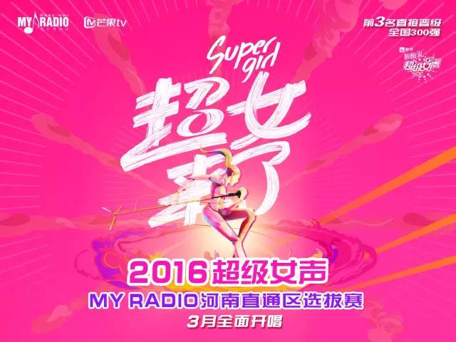 My Radio聯(lián)合芒果TV,2016超級女聲My Radio河南直通區(qū)選拔賽重磅開啟!河南賽區(qū)冠亞季軍,直接晉級全國300強(qiáng)。