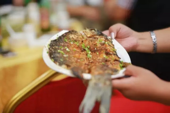 第一名喝完的魚油可以為他所在的桌贏得一只烤羊腿!