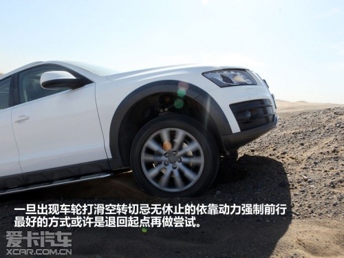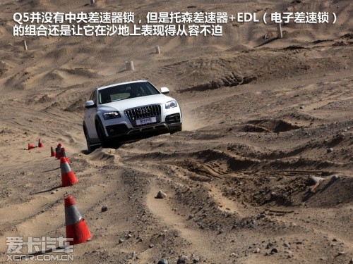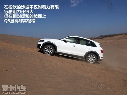 沙坡前半部分的坡度相對要緩一些,而奧迪Q5通過這里的過程自然也是毫不費(fèi)力。那么在接下來更陡的后半部分當(dāng)中,坡度的增大導(dǎo)致了車速急劇下降,此時松軟的沙子也就成為了車輛繼續(xù)攀爬的絆腳石,恰恰也就在此刻,檢驗quattro四驅(qū)系統(tǒng)真正能耐的時候隨之而來。
