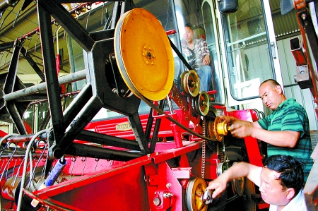 5月7日,武陟縣農(nóng)機(jī)局的技術(shù)人員正在幫助農(nóng)機(jī)手檢修小麥?zhǔn)崭顧C(jī)。“三夏”臨近,武陟縣農(nóng)機(jī)局組織技術(shù)人員深入鄉(xiāng)村,對全縣參加跨區(qū)作業(yè)的800多臺小麥聯(lián)合收割機(jī)進(jìn)行全面檢修,并對機(jī)手進(jìn)行安全操作技能培訓(xùn),做好參加跨區(qū)麥?zhǔn)铡皶?zhàn)”的準(zhǔn)備。 馮小敏 李福利 攝